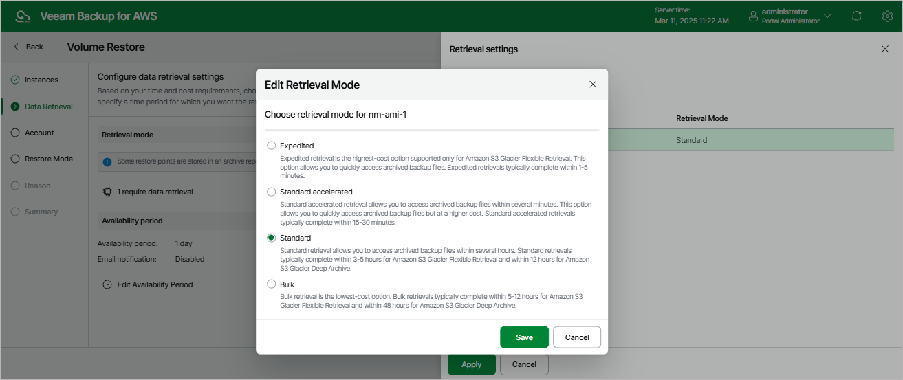 2. In the Edit Retrieval Mode window, select the retrieval mode that Veeam Backup for AWS will use to retrieve the archived data, and click Save. For more information on data retrieval modes, see Retrieving EC2 Data From Archive.