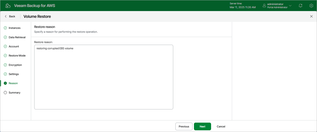 At the Reason step of the wizard, you can specify a reason for restoring EBS volumes. This information will be saved to the session history, and you will be able to reference it later.