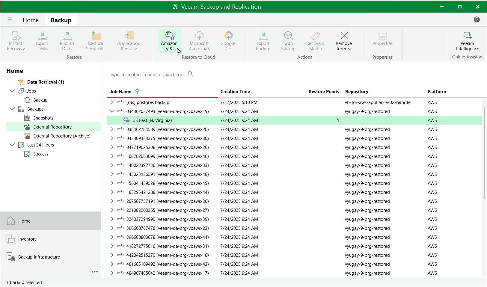 - Expand the AWS account in which VPC configuration has been backed up, select the AWS Region whose VPC configuration you to want restore and click Amazon VPC on the ribbon.