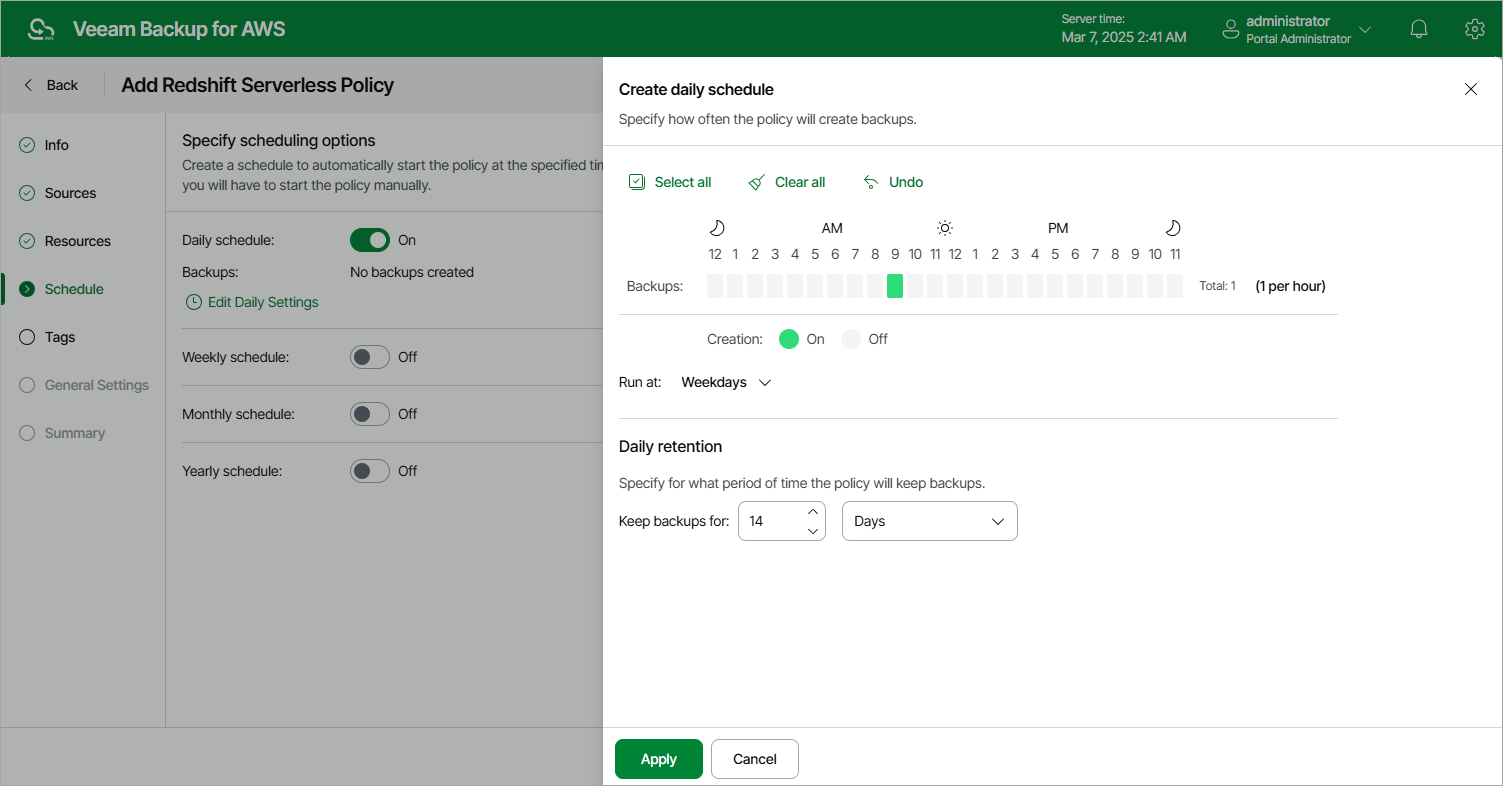 2. In the Create daily schedule section, select hours when the backup policy will create namespace backups.