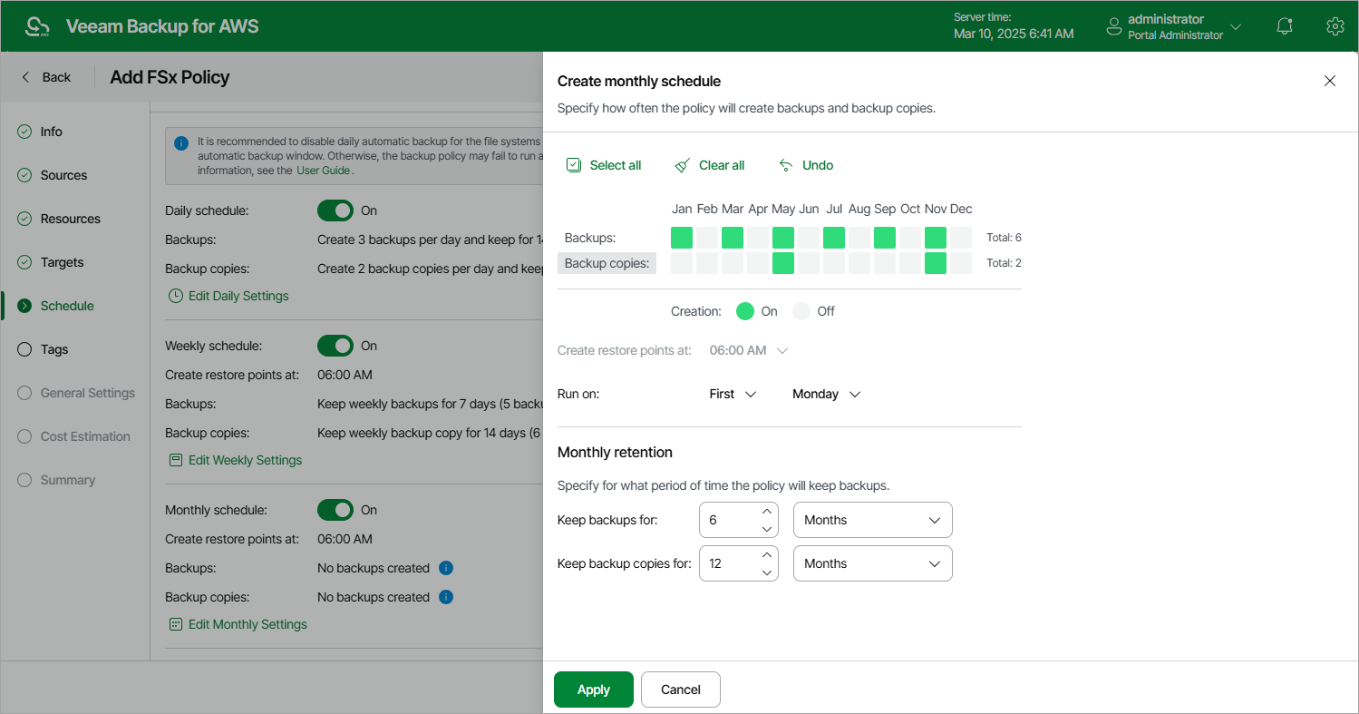 - In the Create monthly schedule section, select months when the backup policy will create file system backups and backup copies.
