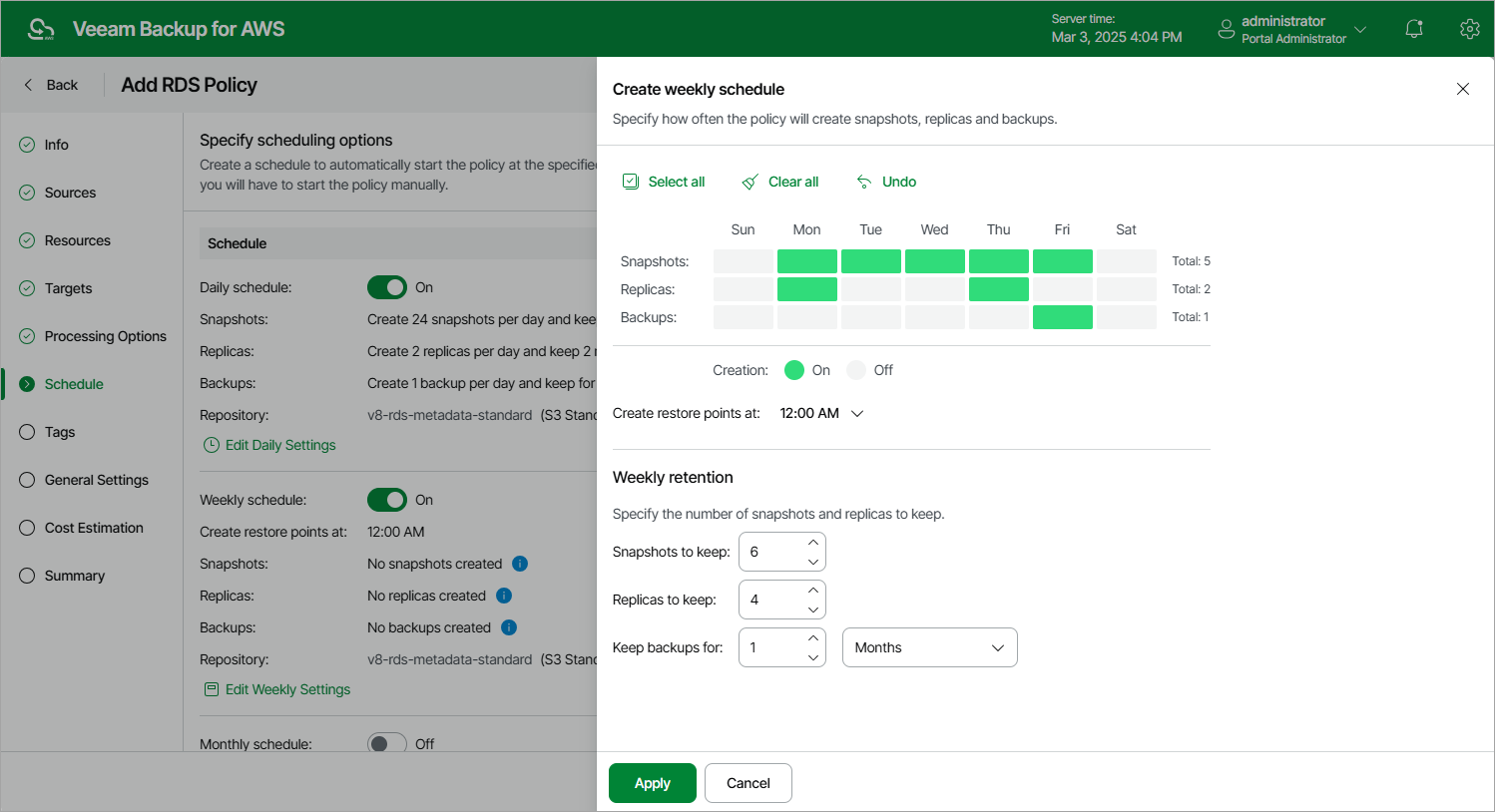 Veeam Backup for AWS does not create snapshot replicas and image-level backups independently from cloud-native snapshots. That is why when you select days to create snapshot replicas and image-level backups, the same days are automatically selected for cloud-native snapshots. To learn how Veeam Backup for AWS performs backup, see RDS Backup. |