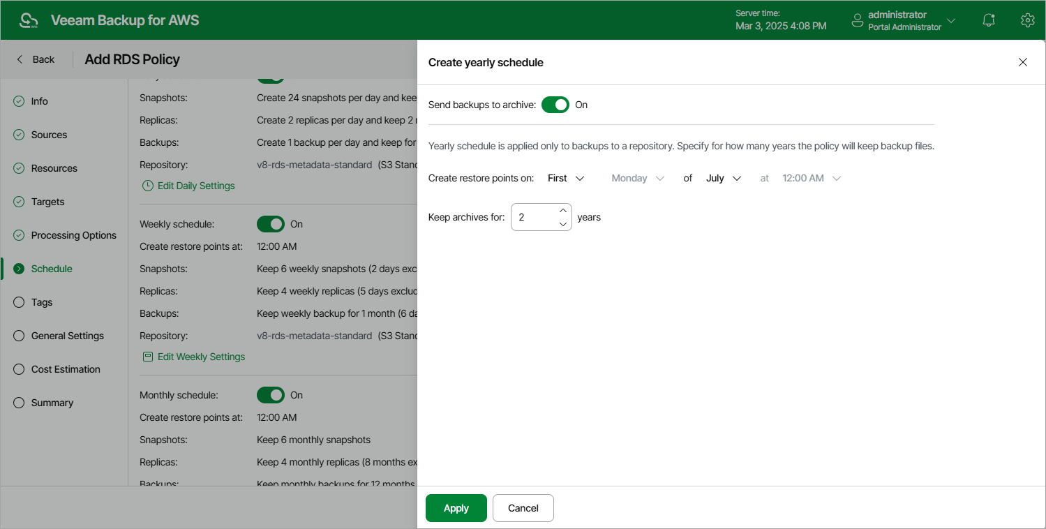 Veeam Backup for AWS will start applying the configured retention settings as soon as the backup policy produces restore points. Even if you disable the yearly schedule after the restore points are created, the retention policy will still be applied to these restore points. As a workaround, you can modify the configured retention settings. |