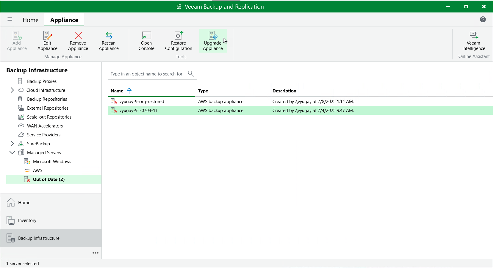- Select the necessary backup appliance and click Upgrade Appliance on the ribbon.