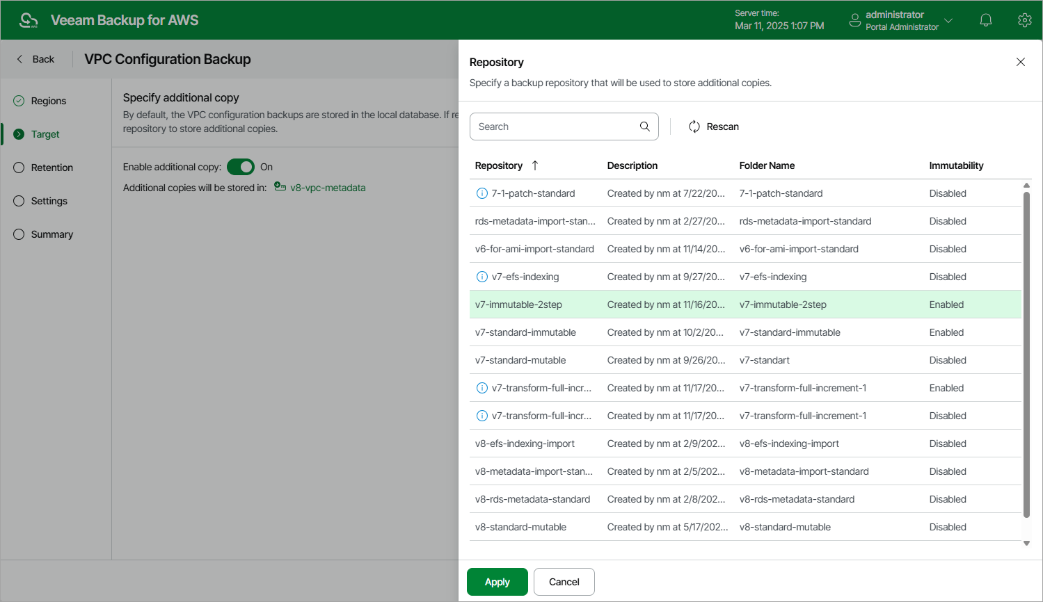 By default, Veeam Backup for AWS stores VPC configuration backups in the Veeam Backup for AWS database. You can instruct Veeam Backup for AWS to save additional VPC configuration backup copies to a backup repository. To do that: