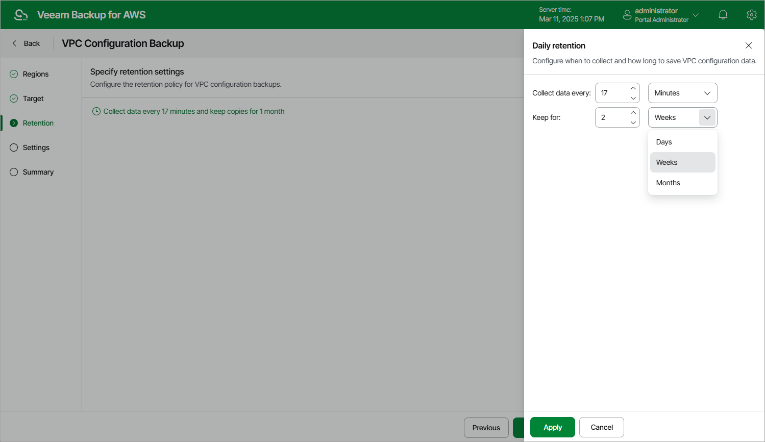 At the Retention step of the wizard, specify retention settings for VPC configuration backups:
