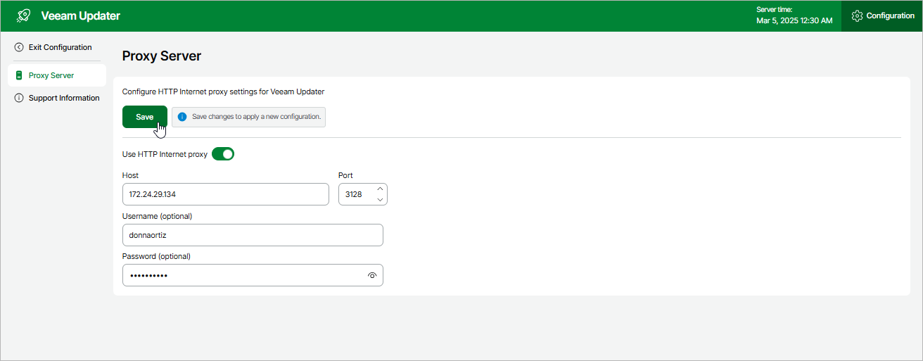 To check for available software package updates for Veeam Backup for AWS, the Veeam Updater service running on the backup appliance connects to the Veeam Update Repository over the internet. If the backup appliance is not connected to the internet, you can instruct Veeam Backup for AWS to use an HTTP proxy that will allow Veeam Updater to access to the required resources.