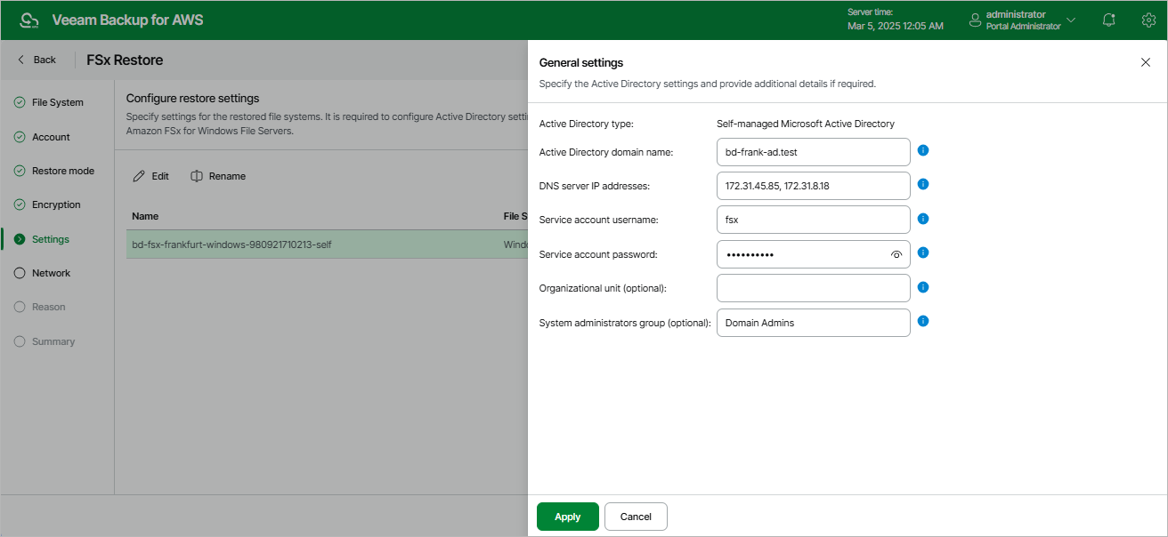 - [Optional] In the System administrators group filed, enter the name of an AD group that has privileges to manage the restored file system.