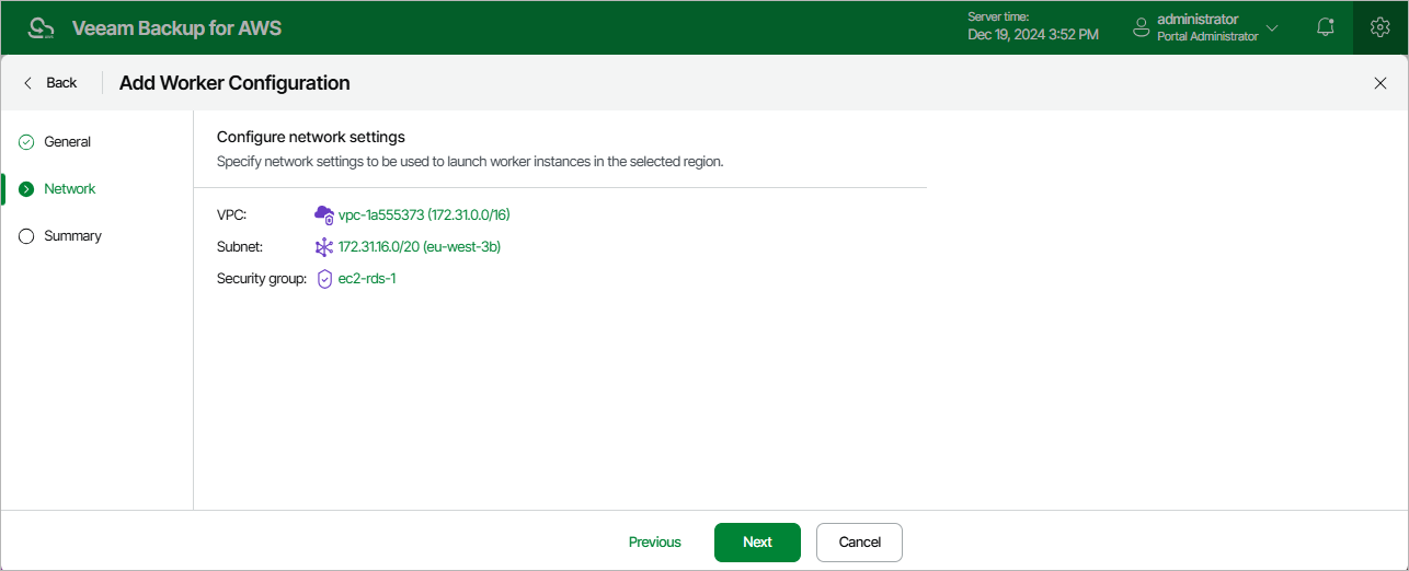 Veeam Backup for AWS will apply the specified network settings to all worker instances that will be deployed in the AWS Region and Availability Zone selected at the General step of the wizard.
