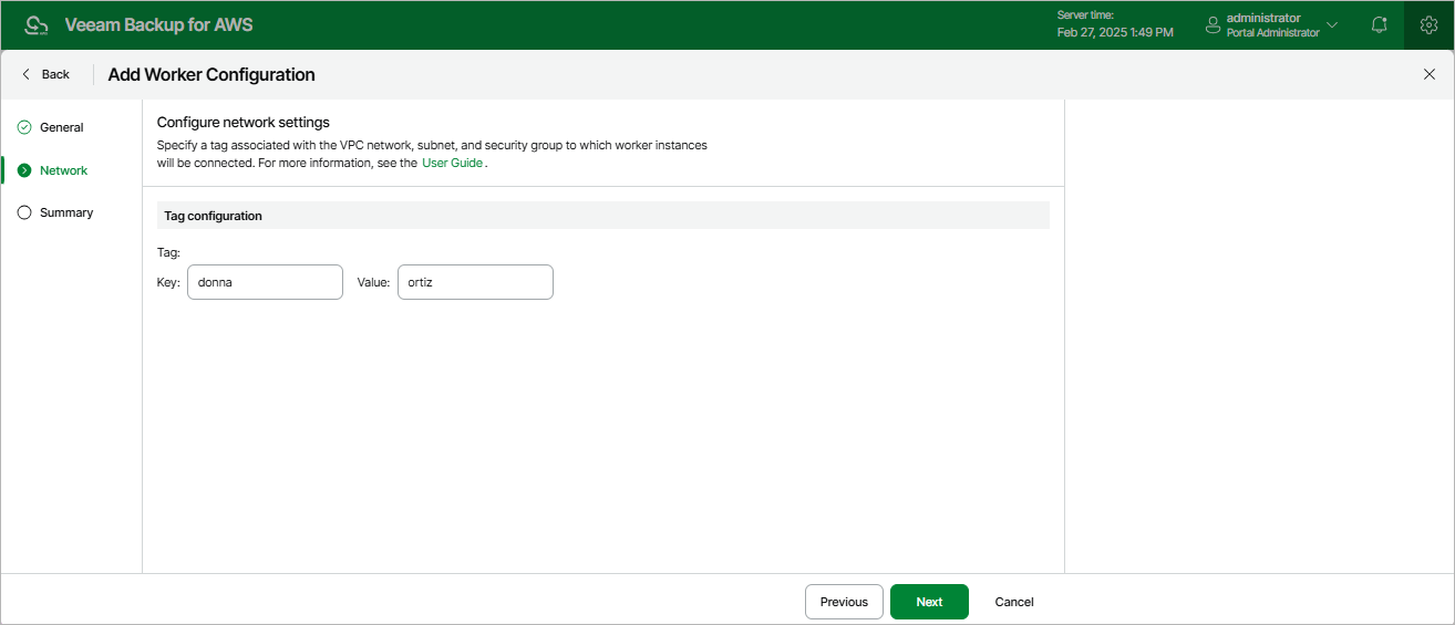 - If you have selected the Organization option at step 2 of the wizard, specify the key and value of the AWS tag associated with the security group, VPC network and subnet to which you want to connect worker instances deployed based on the new worker configuration.
