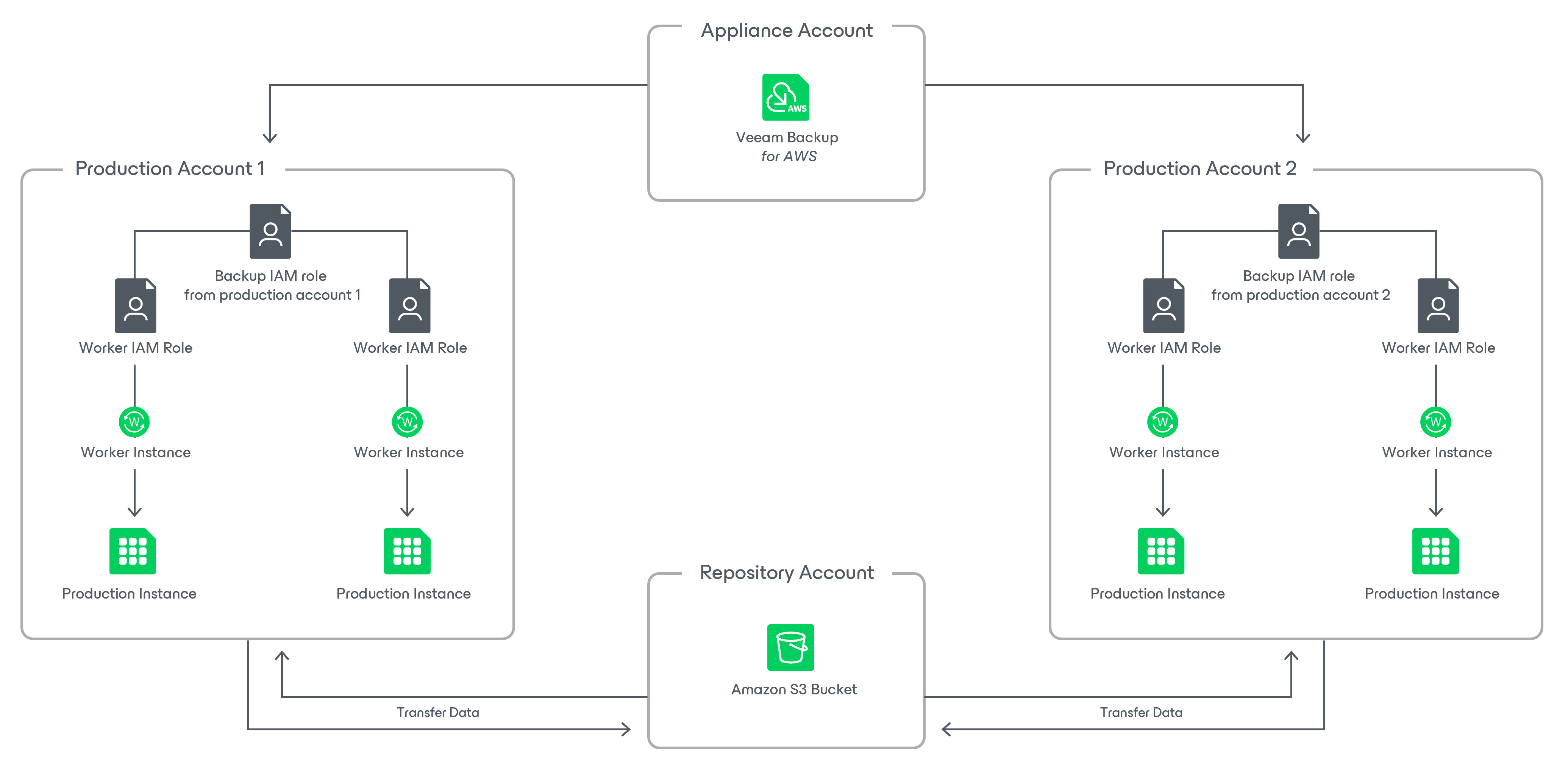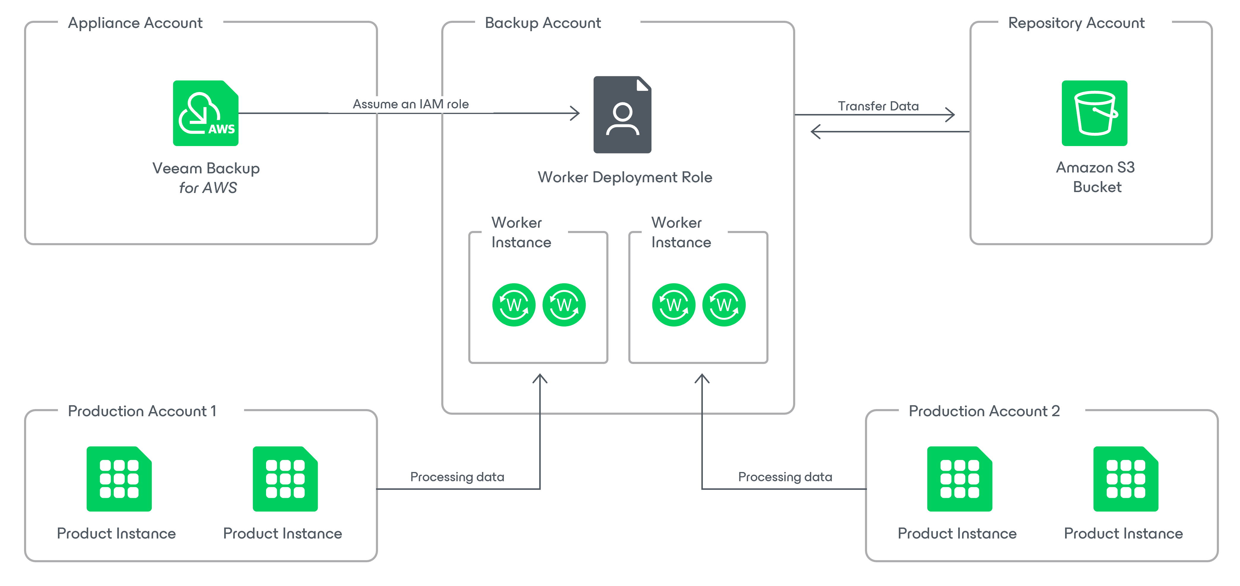 Additionally, if you want to distribute workload across multiple AWS accounts and to manage resource costs for each account separately, you can instruct Veeam Backup for AWS to deploy worker instances in production accounts to perform the following operations: