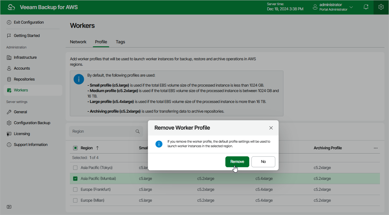 Veeam Backup for AWS allows you to permanently remove sets of worker profiles if you no longer need them. When you remove a profile set, Veeam Backup for AWS does not remove currently running worker instances that have been created based on this set — these instances are removed only when the related operations complete.