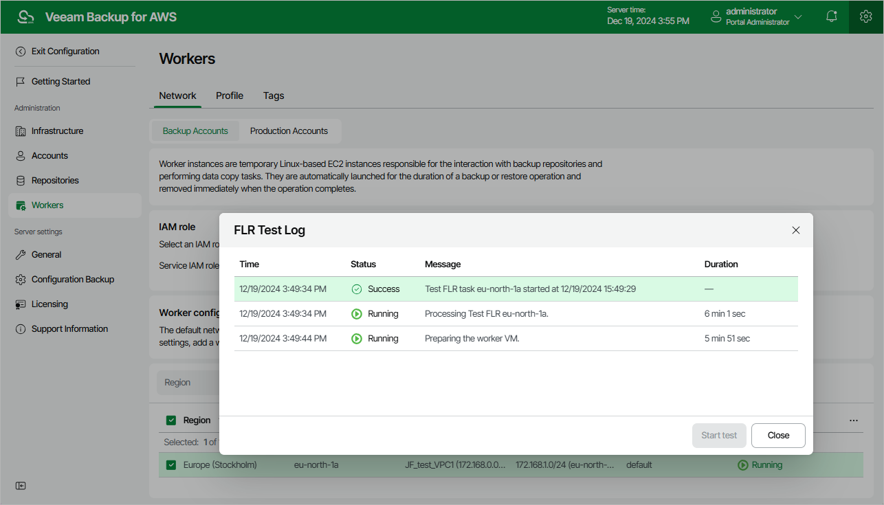 When performing file-level recovery for an EC2 instance, Veeam Backup for AWS deploys a worker instance, attaches and mounts EBS volumes of the EC2 instance to the worker instance and launches file-level recovery browser to allow users to browse, download and restore files and folders. To make sure whether worker network settings are configured properly, and the file-level recovery browser is accessible from your local machine, it is recommended that you run a file-level recovery test before you start file-level recovery operations in an AWS Region.