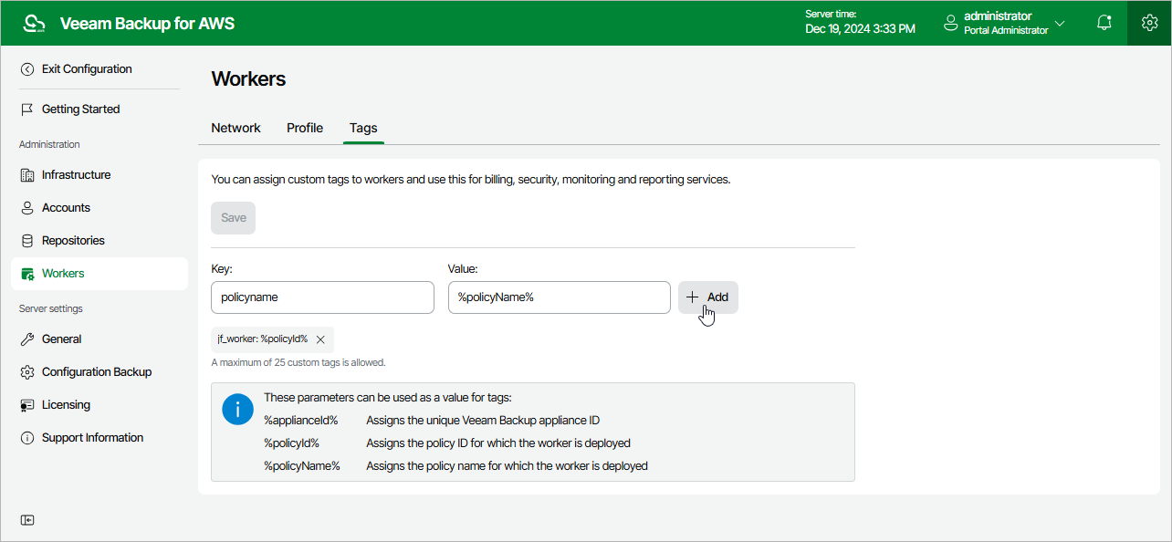 You can use a number of runtime variables as tag values to allow Veeam Backup for AWS to automatically fill in specific information for worker instances deployed during data protection operations. However, for worker instances deployed during restore operations, retention tasks, configuration checks and FLR tests, the values of the %policyid% and %policyName% variables will be replaced with operation names. |