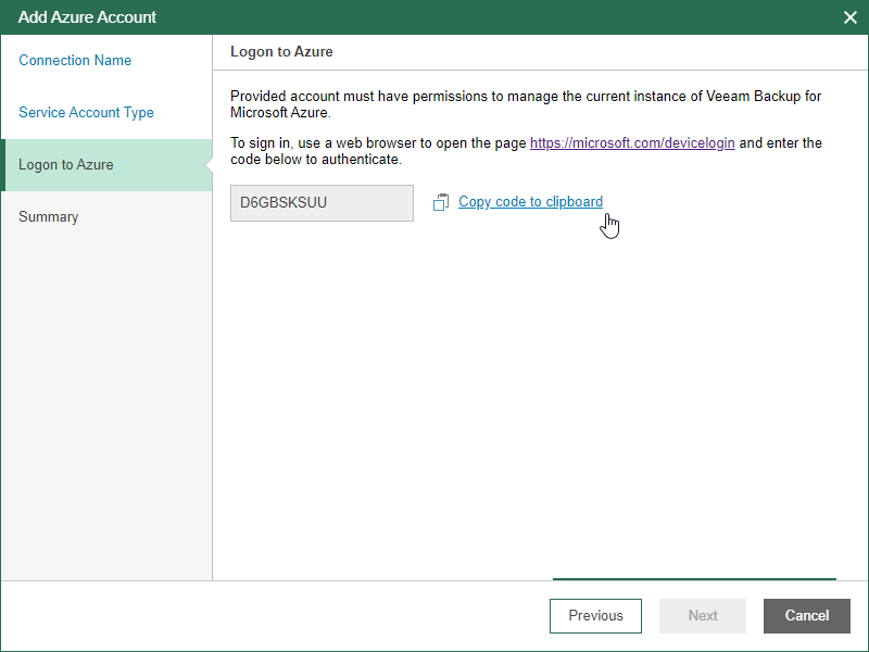 At the Logon to Azure/Service Account step of the wizard, select a logon type to Microsoft Azure.