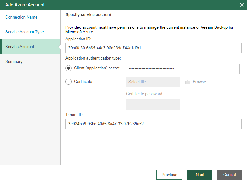 When you specify an existing service account, Veeam Backup for Microsoft Azure connects to the existing Azure AD application that grants access to Microsoft Azure resources. Make sure to create such an application in advance. For more information on how to create an Azure AD Application, see this Microsoft article.