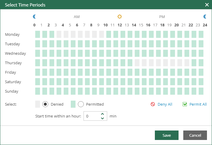 - Select a block that corresponds to the day of the week (vertical axis) and to the time interval (horizontal axis) on which you want to allow or prohibit the execution of a backup policy.