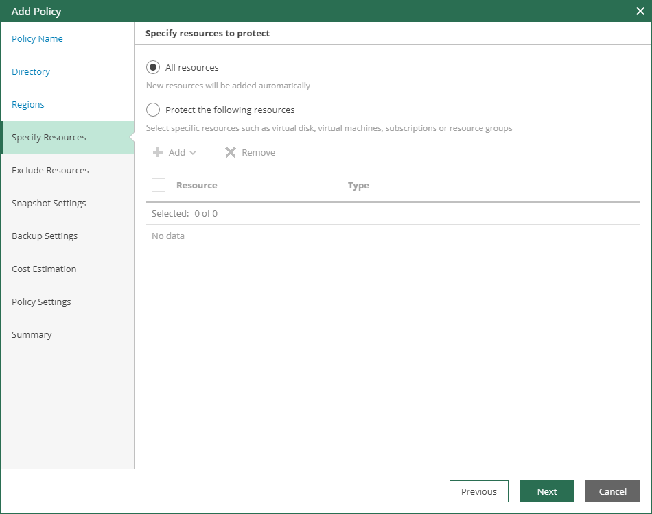 At the Specify Resources step of the wizard, select Microsoft Azure resources that you want to back up.