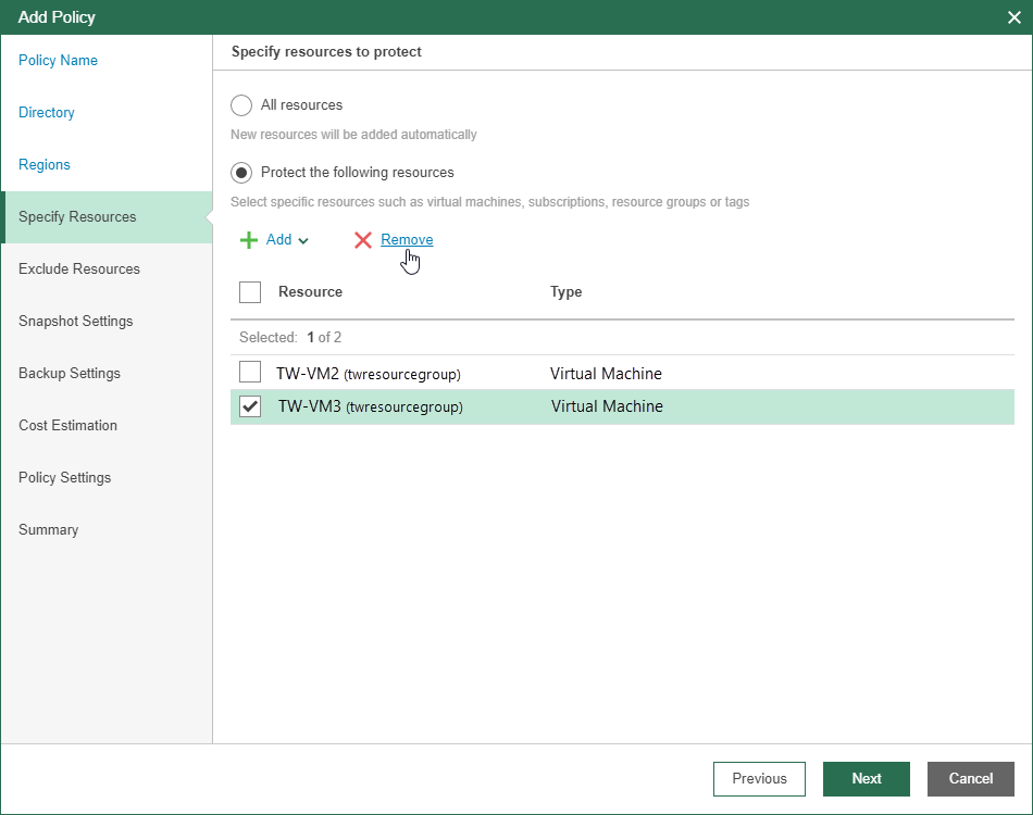 If you want to remove some objects from the scope, select check boxes next to the necessary Microsoft Azure resources and click Remove.