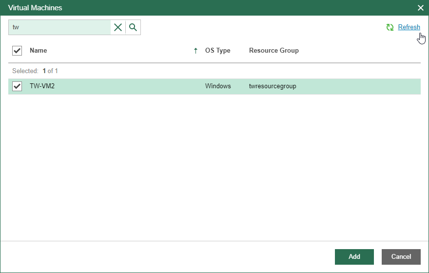 Note that it may take some time for Veeam Backup for Microsoft Azure to retrieve information about Microsoft Azure VMs. If for some reason Veeam Backup for Microsoft Azure fails to retrieve information automatically, click Refresh.
