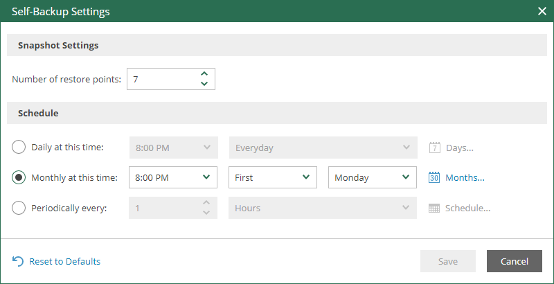 - Click Customize settings to configure a schedule according to which new snapshots must be created. The Self-Backup Settings window appears.