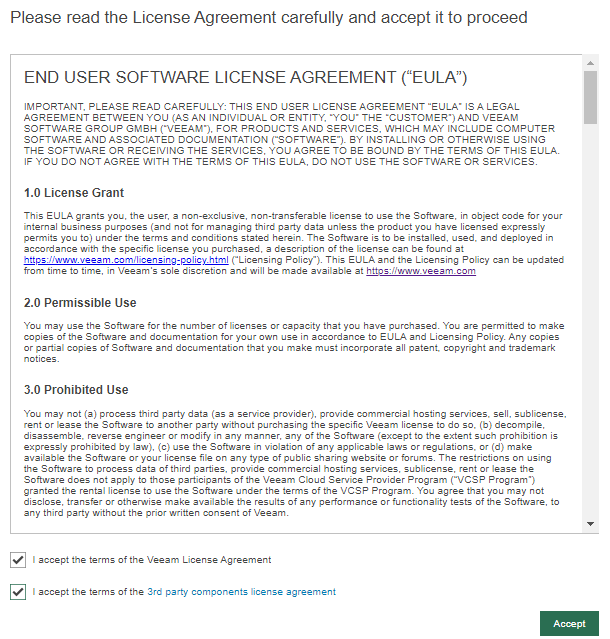 - Read and accept the license agreement for Veeam and 3rd party components that Veeam incorporates.