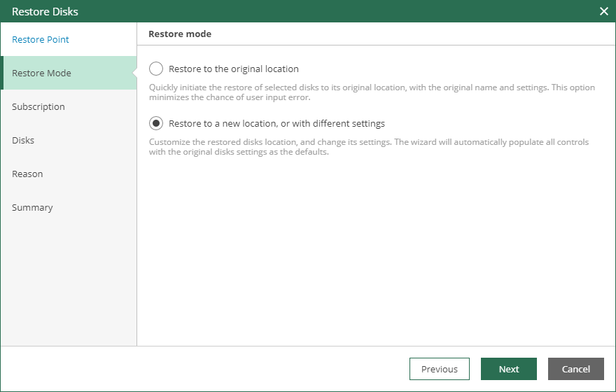 At the Restore Mode step of the wizard, choose whether you want to restore virtual disks of your Microsoft Azure VMs to the original or to a custom location.