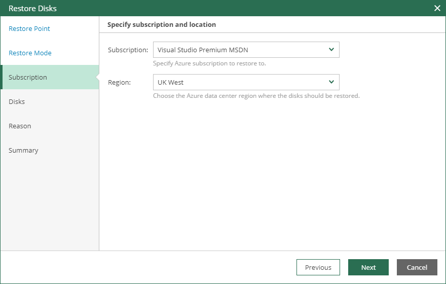 At the Subscription step of the wizard, select a Microsoft Azure subscription and location to which you want to restore virtual disks of the selected Microsoft Azure VMs.