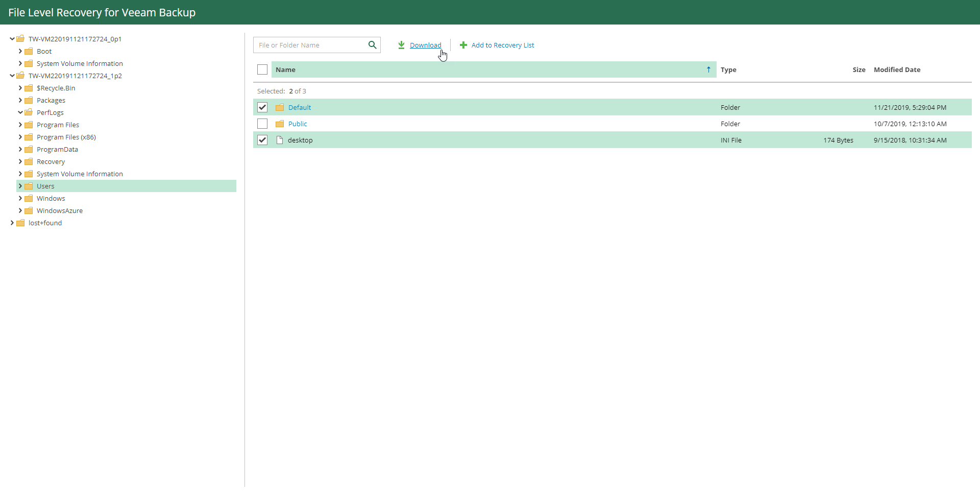 With the File Level Recovery for Veeam Backup browser, you can download files and folders from backups to a local computer as a .zip archive.