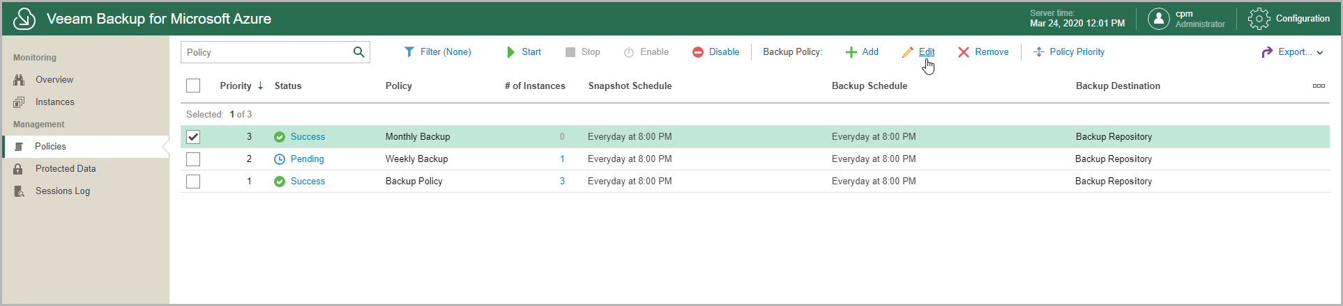 Veeam Backup for Microsoft Azure allows you to edit backup policies. For example, you may want to add some Microsoft Azure VMs to a backup policy or change a backup policy description.