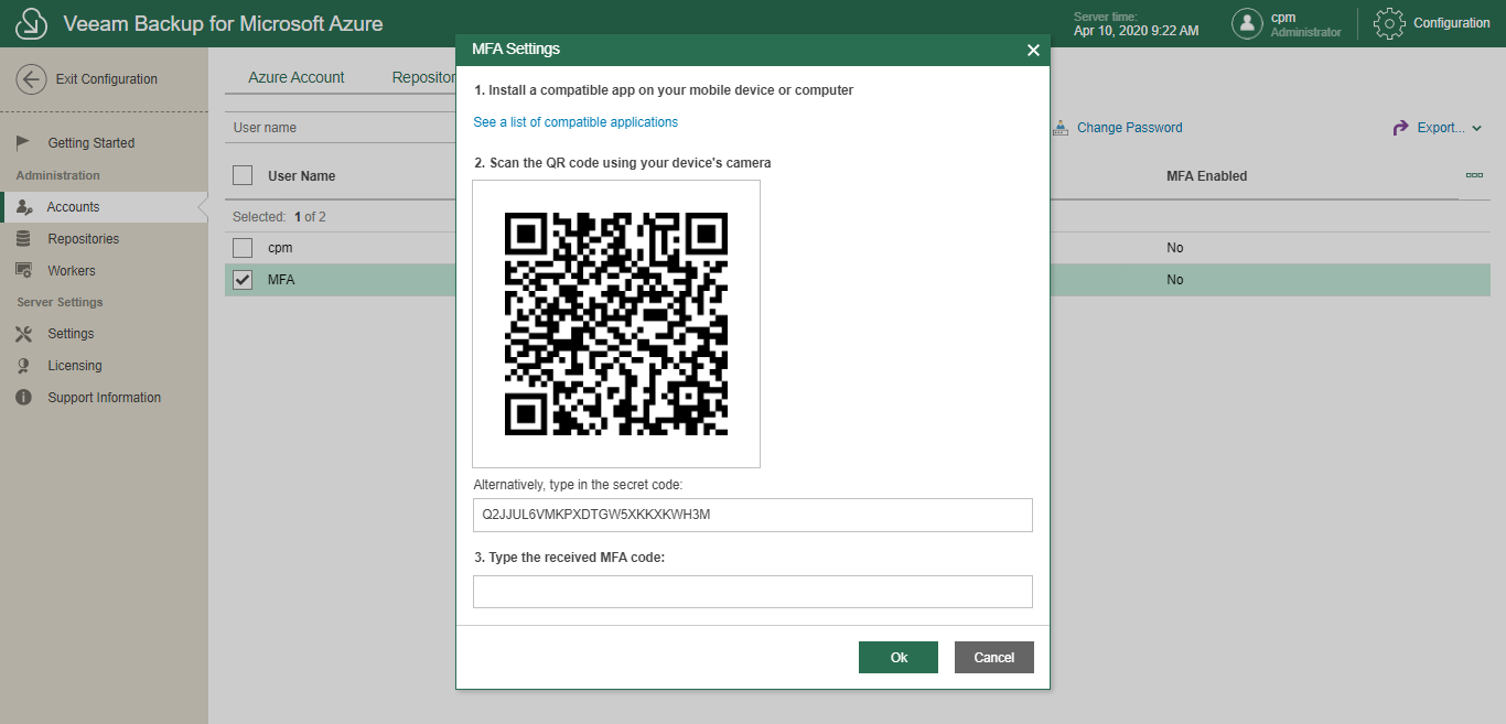 Veeam Backup for Microsoft Azure will display the MFA Settings window.