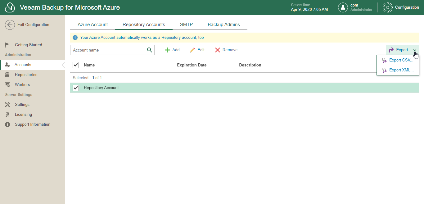 Veeam Backup for Microsoft Azure allows you to export data records about repository accounts as .csv or .xml.