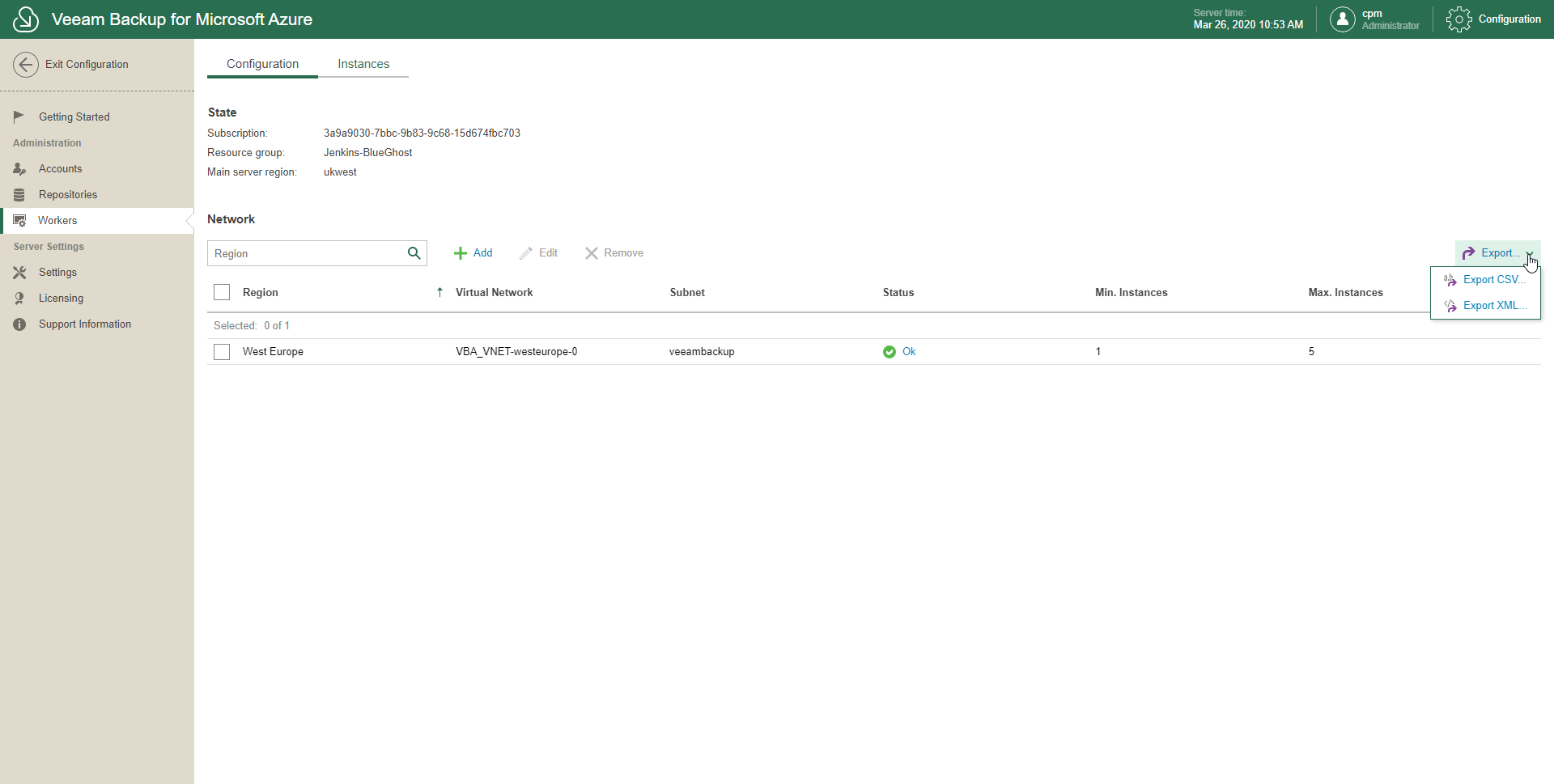Veeam Backup for Microsoft Azure allows you to export records about workers as .csv or .xml.