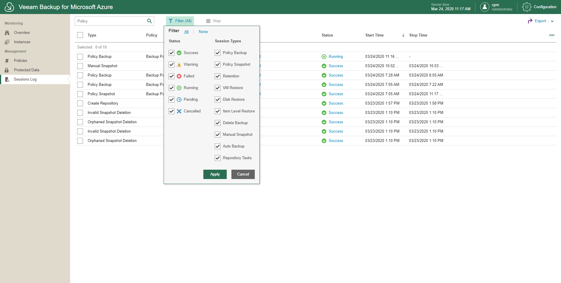 Veeam Backup for Microsoft Azure allows you to configure filtering options to show only records that you need.