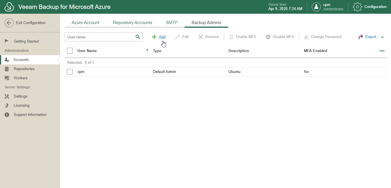 This is an archive version of the document. To get the most up-to-date information, see the current version. Step 1. Launch Add User Wizard In this article To launch the Add User wizard, do the following:In the System Menu, click Configuration.In the inventory pane, in the Administration section, select Accounts.Open the Backup Admins tab.Click Add.