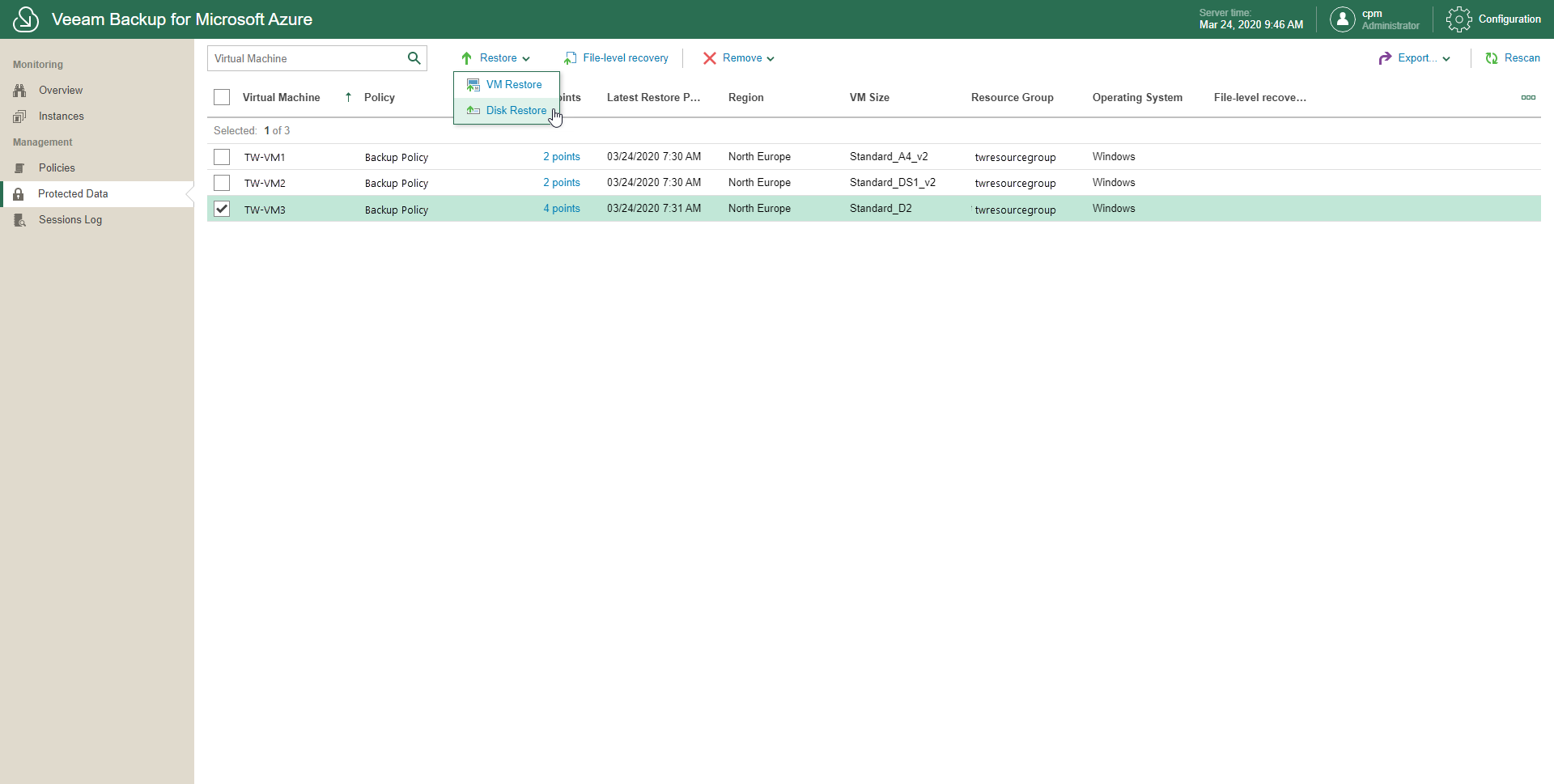 Alternatively, you can click the link associated with the VM that you want to restore in the Restore Points column. Then, in the Available Restore Points window, select a restore point to which to restore data and click Restore > Disk Restore.