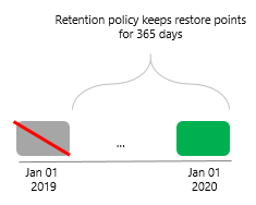 The following is an example in which you have set to keep restore points only for a year (365 days), and a new restore point is being taken on a day 366 (represented as the green block on the right). In such a scenario, the first restore point that was taken on January 1, 2019 (represented as the gray block on the left) is going to be removed.