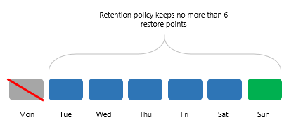 The following is an example of a backup chain consisting of 7 restore points (snapshots) in total. The oldest restore point that was created on Monday is being removed because, as per example, the retention threshold is set to 6 and has been exceeded by one after the 7th restore point (represented as the green block on the right) has been created.