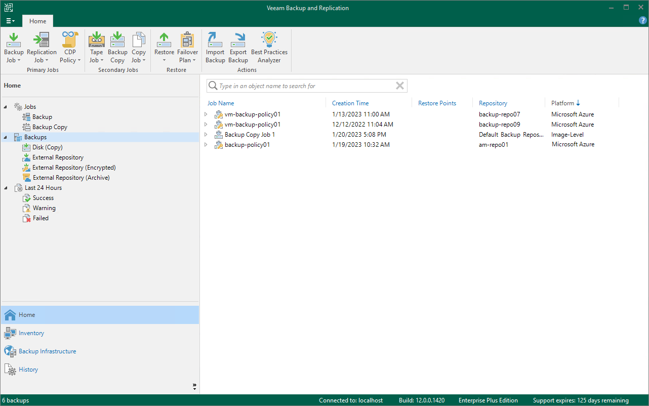 To view and manage backed-up data, navigate to the Backups node of the Home view. The node displays information on all restore points created by Veeam Backup for Microsoft Azure appliances.