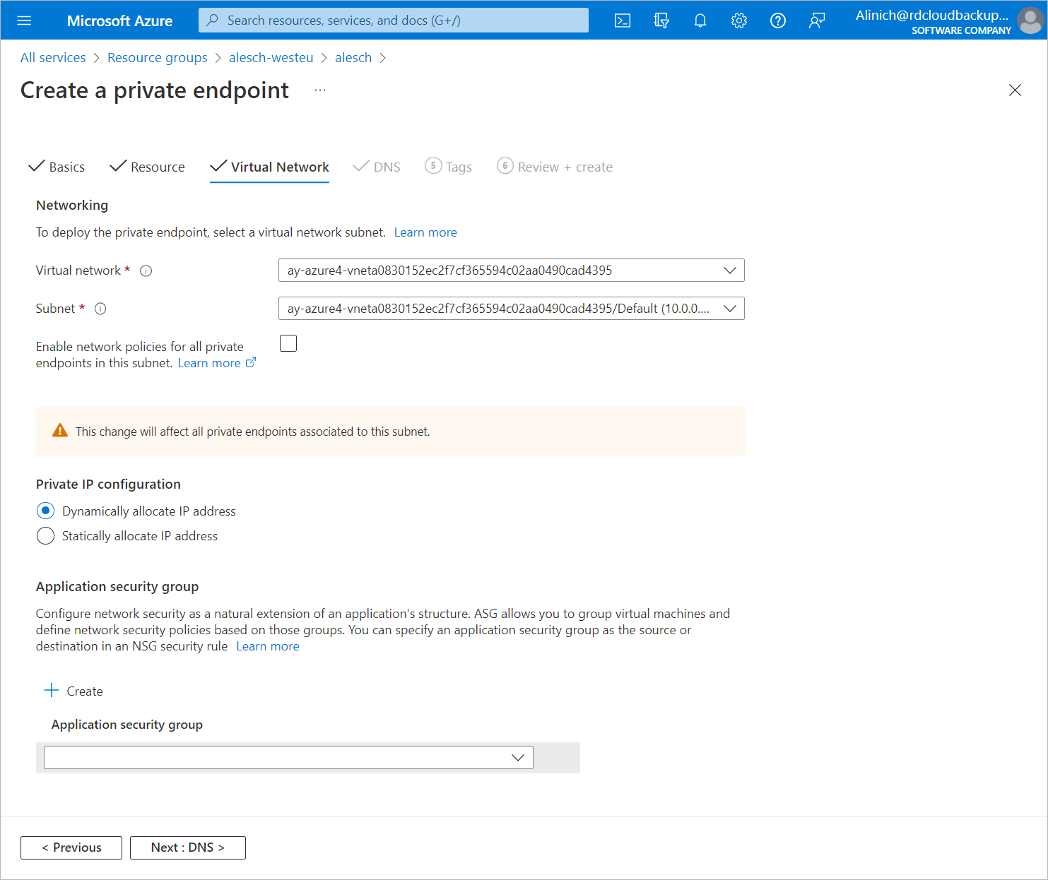 At the Virtual Network step of the Create a private endpoint wizard, do the following: