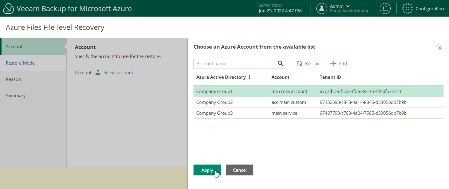 - In the Choose an Azure account window, select the necessary account and click Apply.