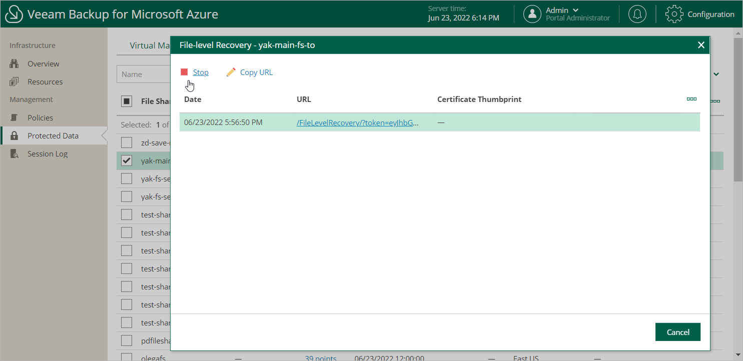 After you finish working with the File-level recovery browser, it is recommended that you stop the restore session. To do that, click Stop in the File-level Recovery window. If you do not perform any actions in the File-level recovery browser for 30 minutes, Veeam Backup for Microsoft Azure will stop the restore session automatically.