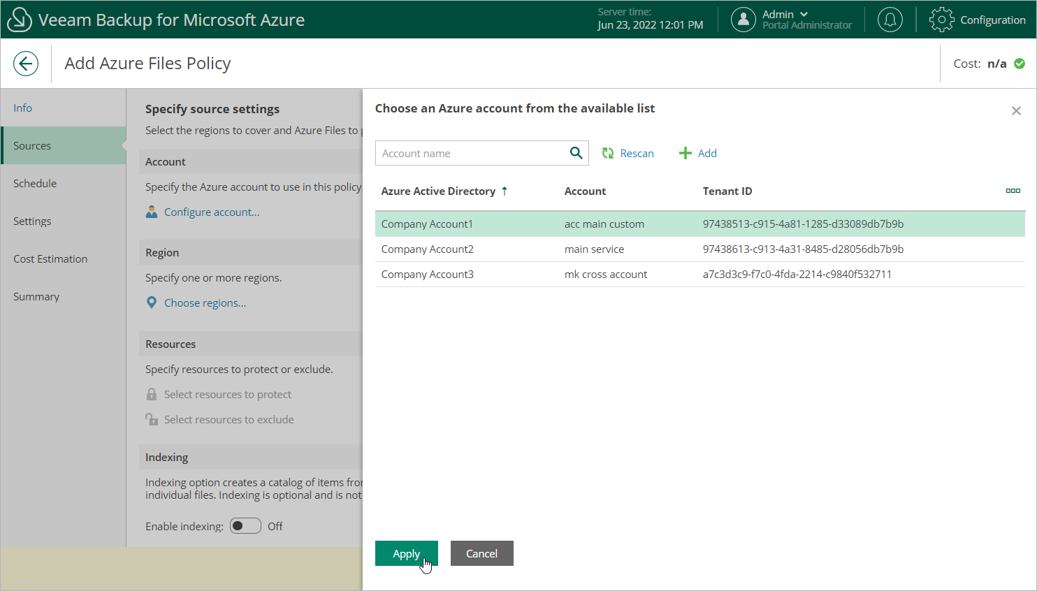 In the Account section of the Sources step of the wizard, specify an Azure account whose permissions will be used to access Azure services and resources, and to create cloud-native snapshots of Azure file shares.