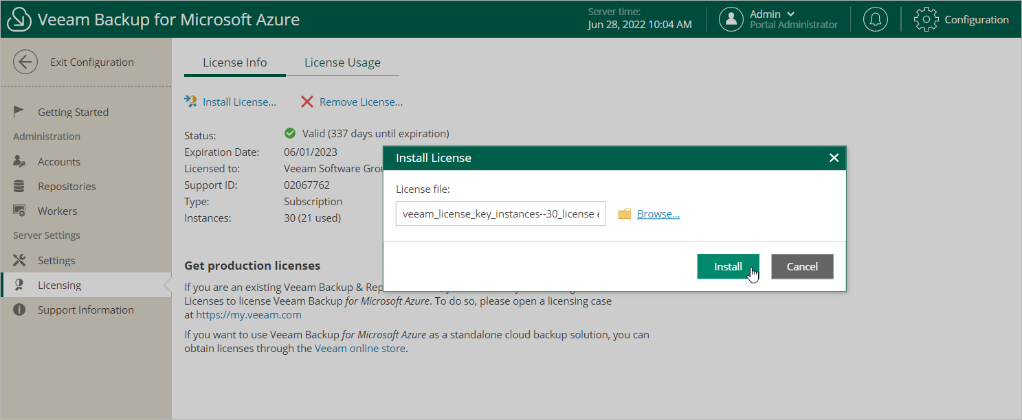 - In the Install License window, click Browse to browse to a license file, and then click Install.