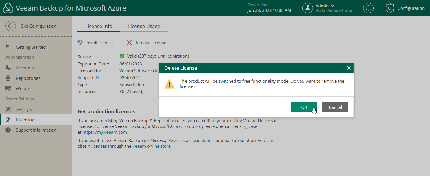 After you remove a license, Veeam Backup for Microsoft Azure will automatically switch back to the Free edition. In this case, according to the FIFO (first-in first-out) queue, only the first 10 instances registered in the configuration database will remain protected. You can revoke license units from these instances as described in section Revoking License Units.