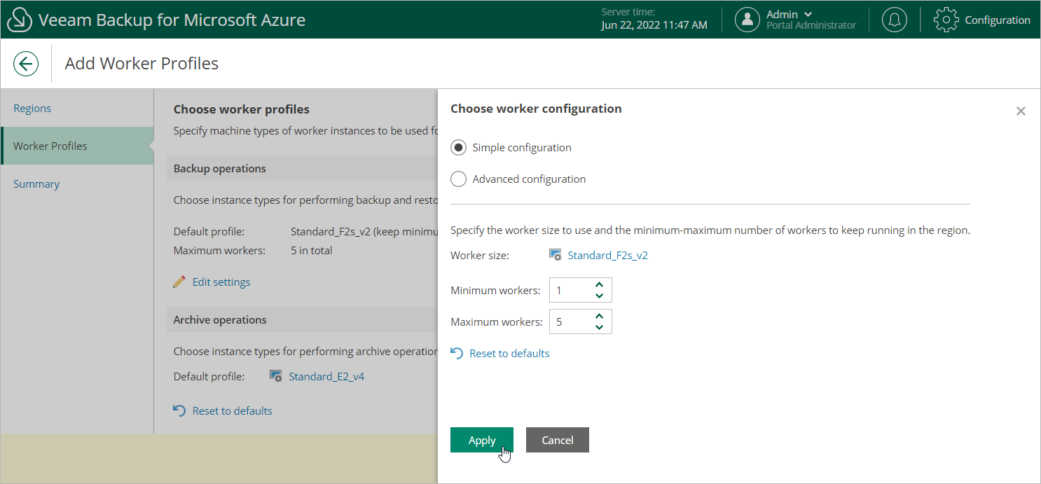 - Use the Simple configuration and Advanced configuration options to choose whether you want to use one single VM size for all worker instances that will be launched in the selected regions to perform backup and restore operations, or to specify a small, medium and large profile for the instances.