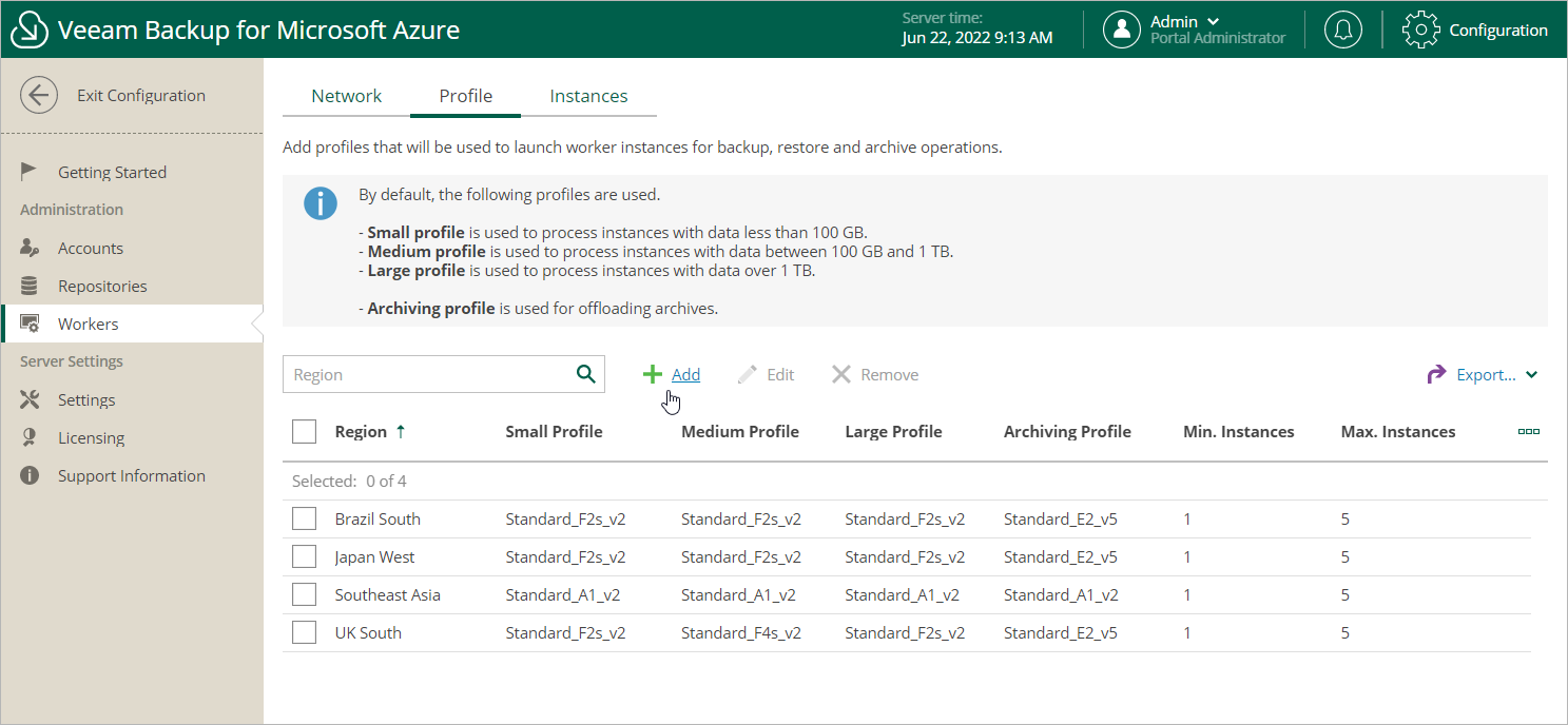 This is an archive version of the document. To get the most up-to-date information, see the current version. Step 1. Launch Add Worker Profiles Wizard To launch the Add Worker Profiles wizard, do the following:Switch to the Configuration page.Navigate to Workers > Profile.Click Add.