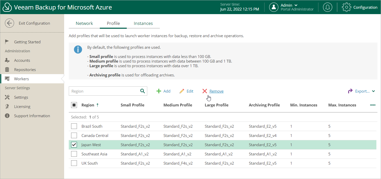 Veeam Backup for Microsoft Azure allows you to permanently remove sets of worker profiles if you no longer need them. When you remove a profile set, Veeam Backup for Microsoft Azure does not remove currently running worker instances that have been created based on this set — these instances are removed only when the related operations complete.