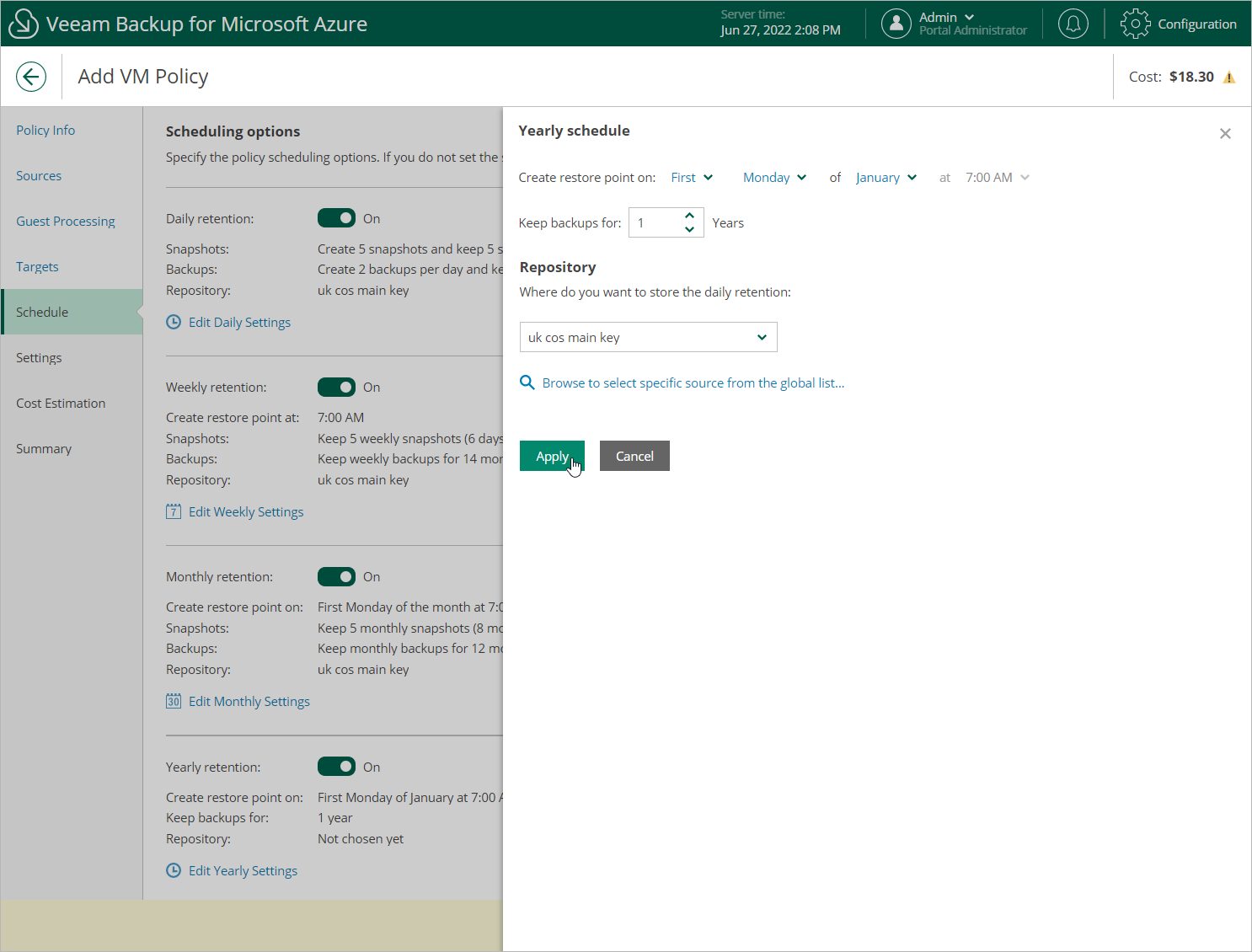 To create a yearly schedule for the backup policy, at the Schedule step of the wizard, do the following: