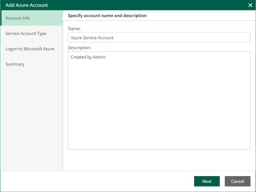 At the Account Info step of the wizard, use the Name and Description fields to enter a name for the new account and to provide a description for future reference. The maximum length of the name is 255 characters.